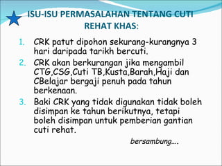 Setahun menerajui Kementerian Kesihatan Khairy Jamaluddin mengakui terdapat beberapa isu yang menjadi keutamaannya untuk diselesaikan jika mempunyai masa. PEMBERIAN GANTIAN CUTI REHAT GCR. Cuti Haji dan Cuti Tibi Kusta dan Barah tidak diambil kira sebagai tempoh perkhidmatan yang melayakkan bagi tujuan pengiraan kelayakan Cuti Rehat tahunan Cuti Rehat Khas atau cuti-cuti.